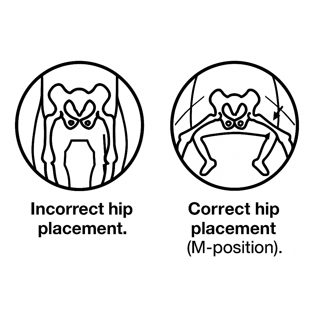 Our baby sling is designed to support the natural M-position, keeping your baby's knees higher than their bottom and hips properly aligned. This healthy hip positioning helps prevent discomfort and supports optimal hip development — especially important for newborns and young infants.
